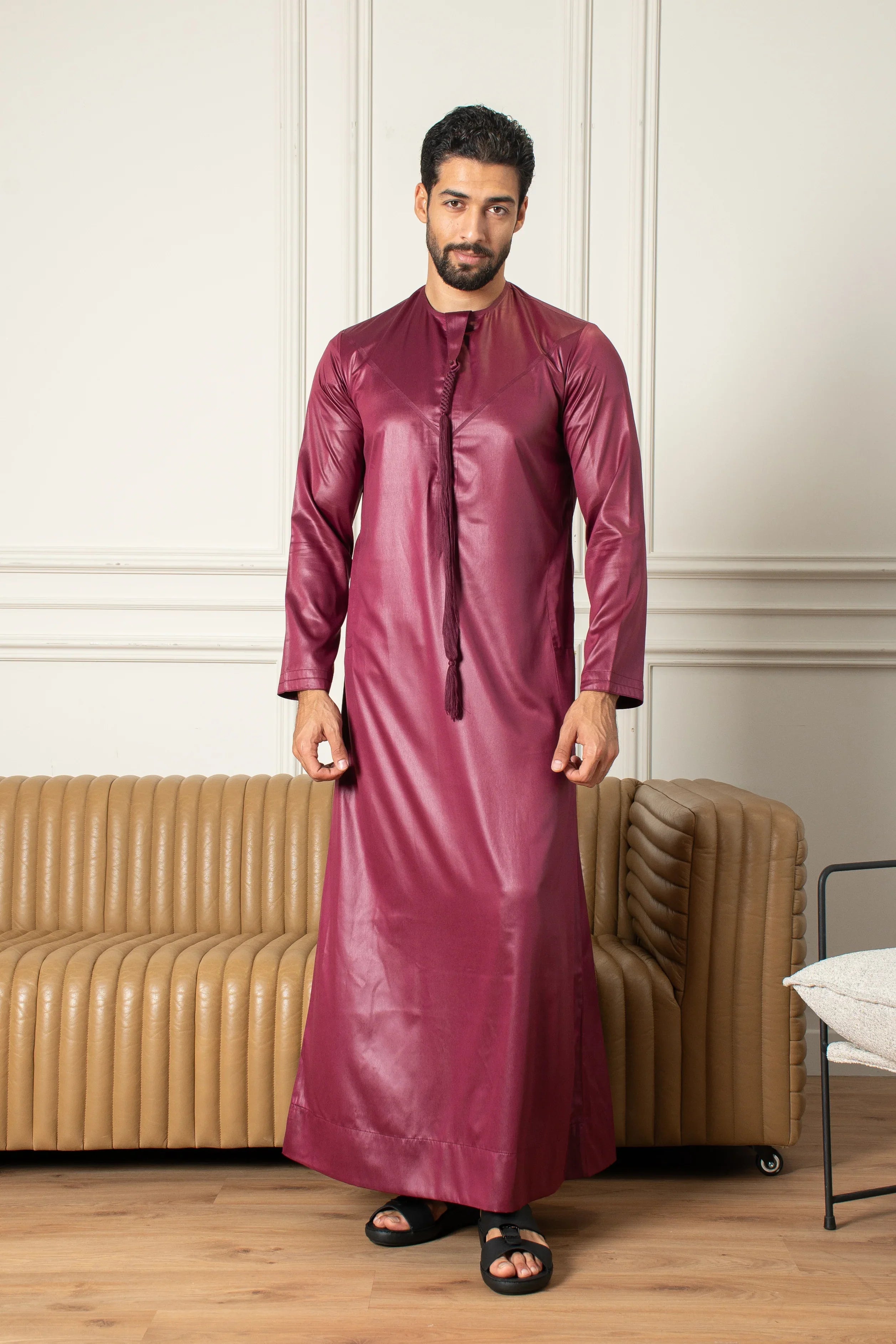 يضمن القماش الخفيف الراحة دون التضحية بالجودة. سواء كنت تحضر مناسبة رسمية أو احتفالاً، سيترك هذا الثوب انطباعاً لا يُنسى بفضل لمعانه الفريد ومظهره العصري.