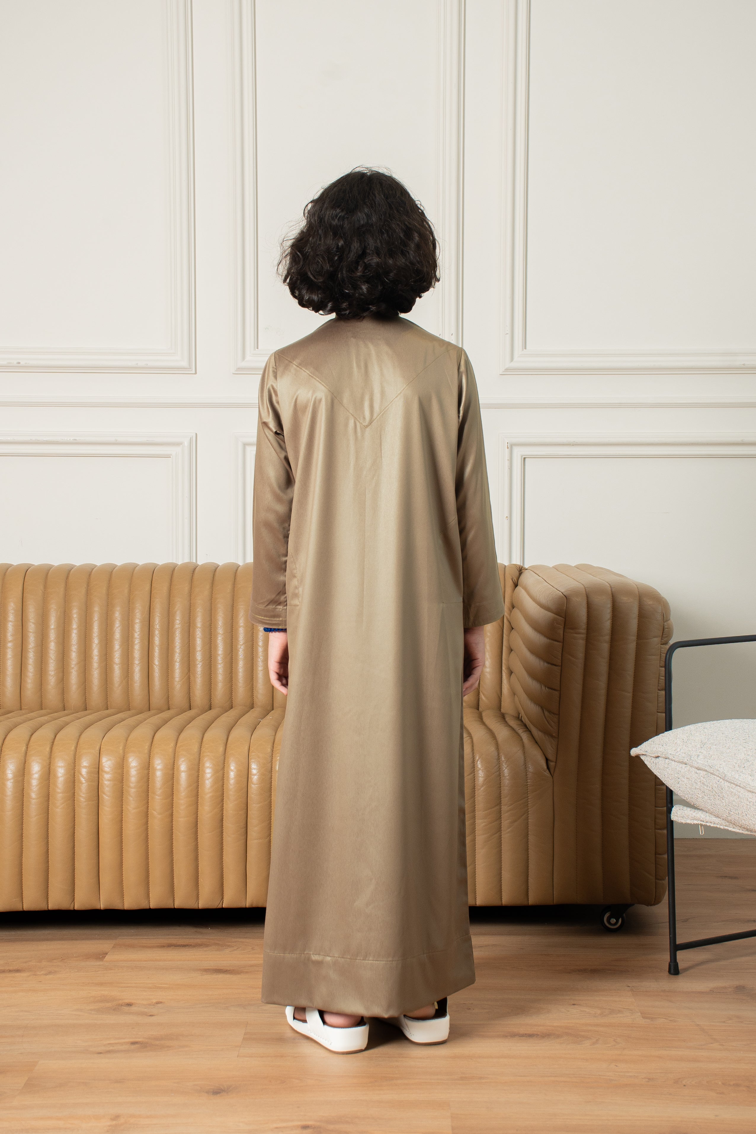 تألقي بأناقة خالدة مع الثوب الإماراتي بلون البرونز العربي. مصنوع من قماش فاخر لامع، يجمع هذا الثوب بين التصميم الإماراتي التقليدي ولمسة من الرقي.