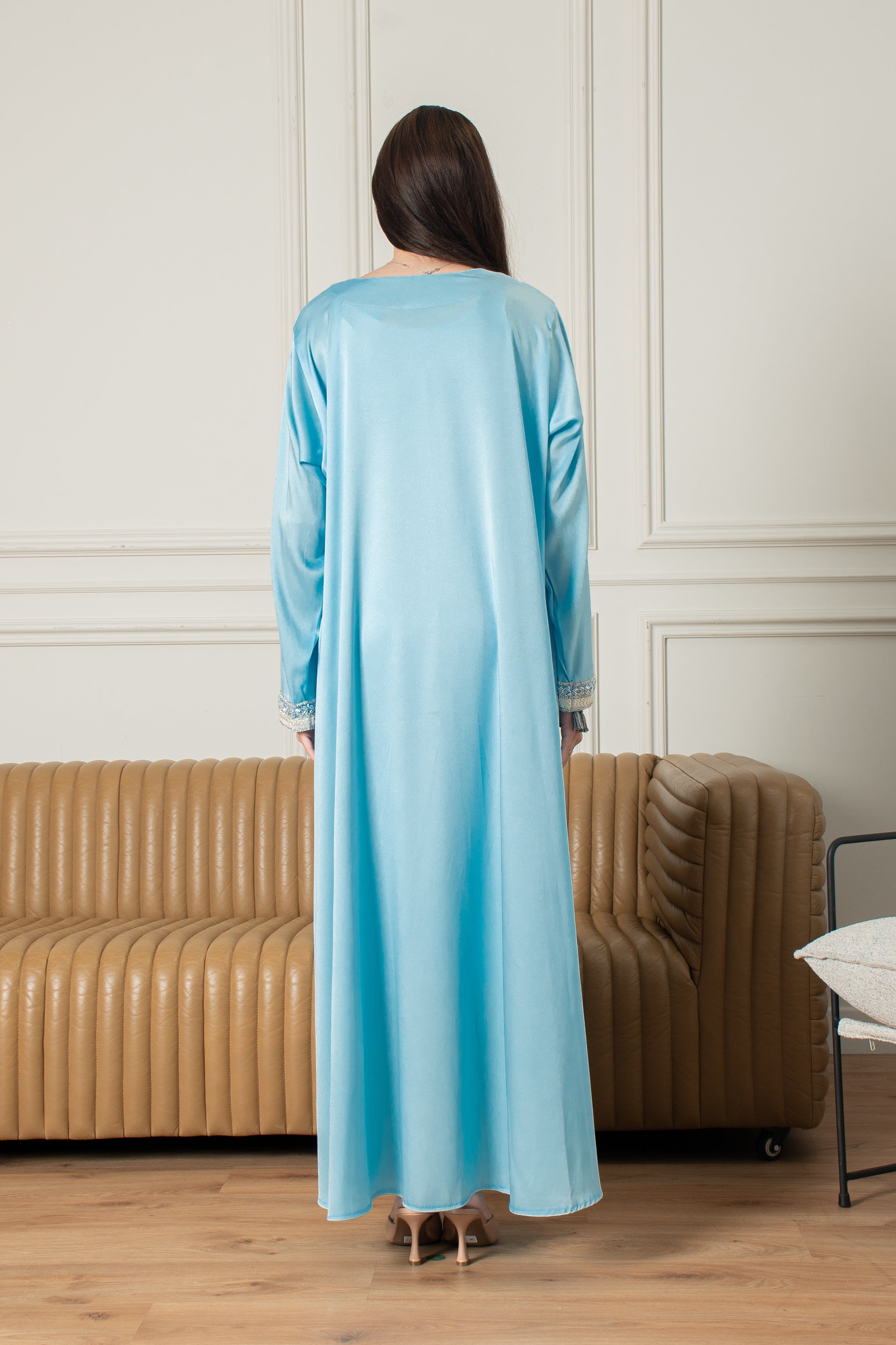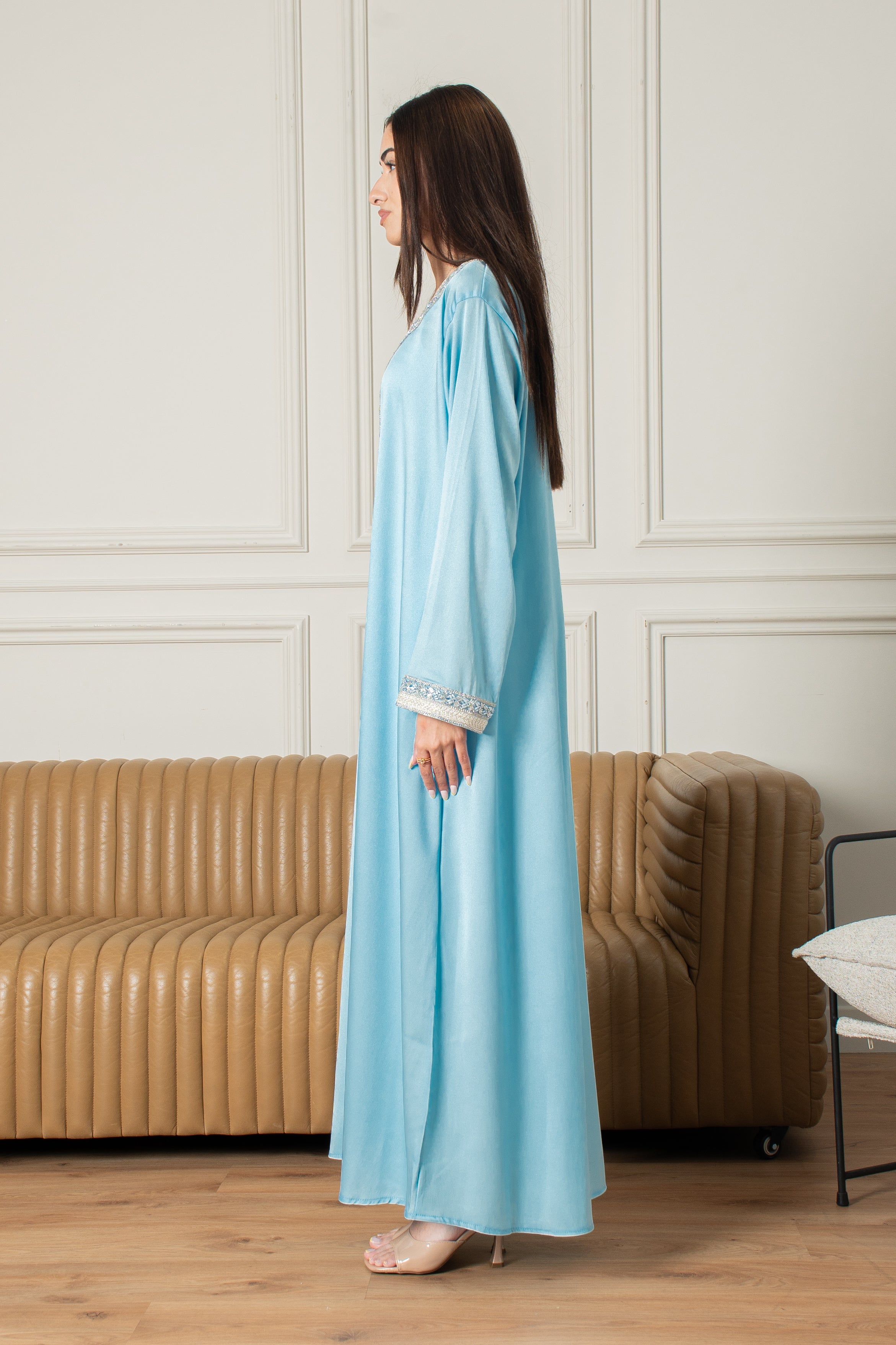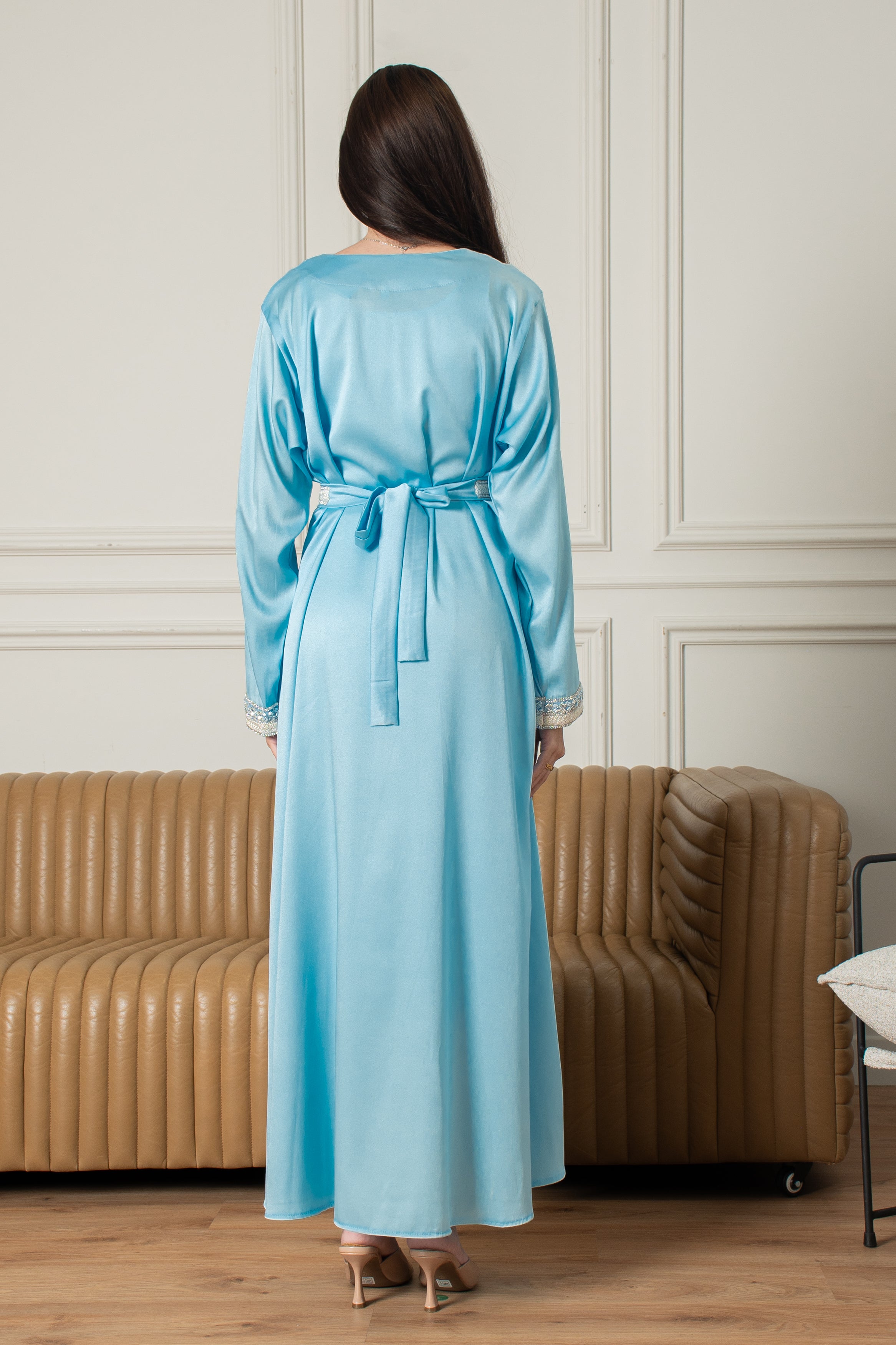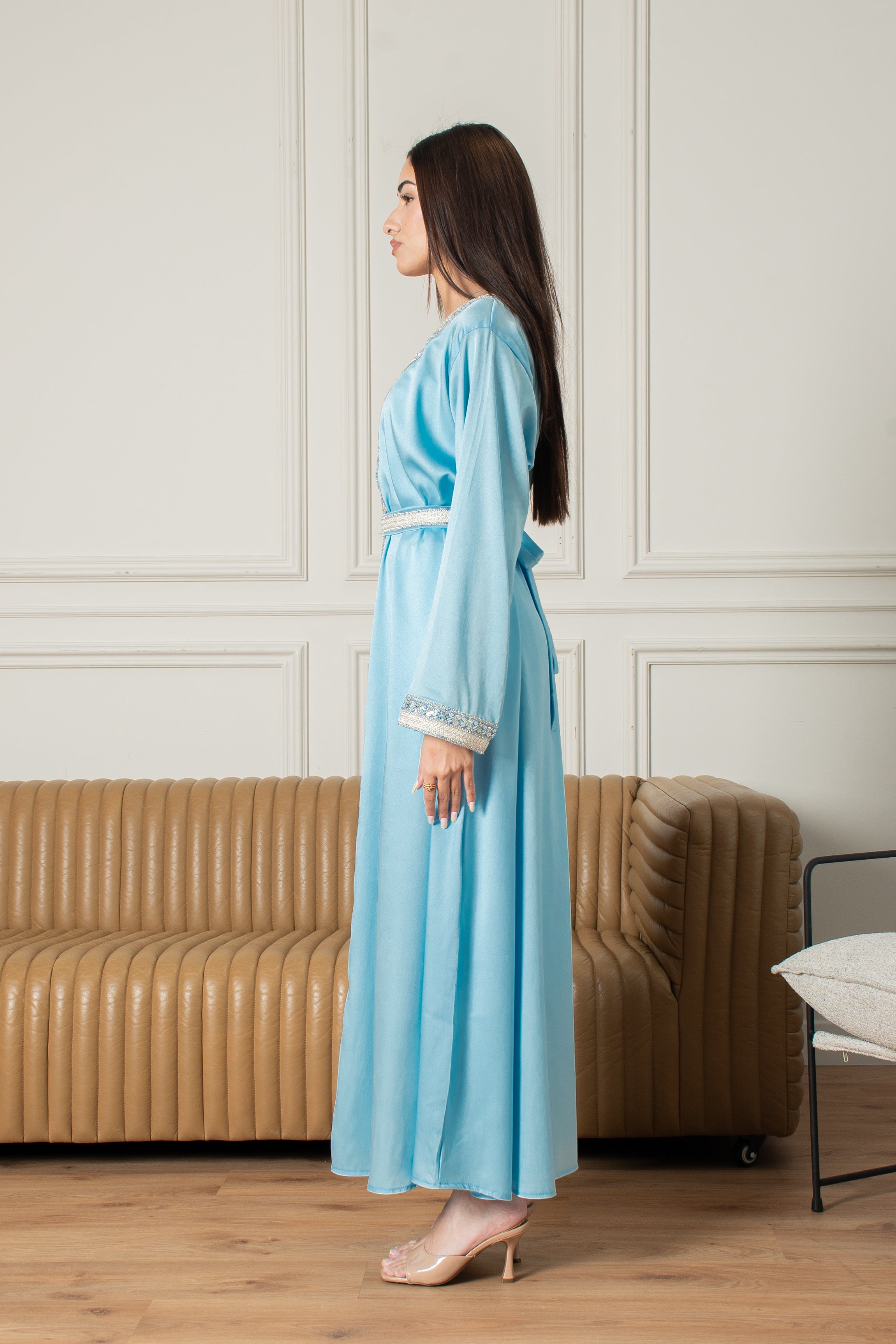 الجلابة الياسمينية طقم مغربي من قطعتين، سهل الارتداء ومثالي للمناسبات الخاصة، يتميز بتطريز بسيط على الصدر والأكمام بلون أزرق فاتح ناعم. يأتي مع حزام يمكنك ارتداؤه لإطلالة أنيقة أو تركه لإطلالة أكثر راحة.
