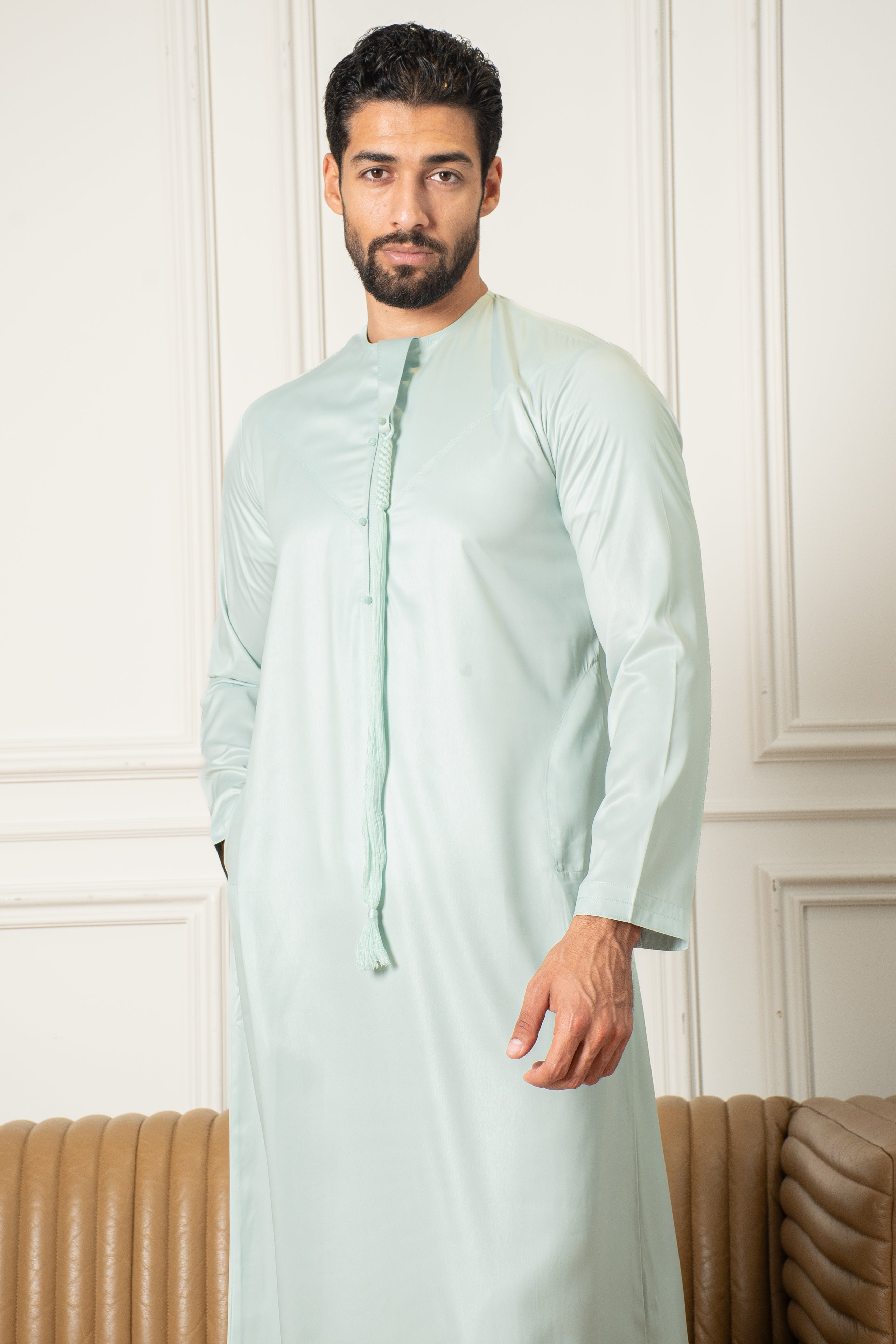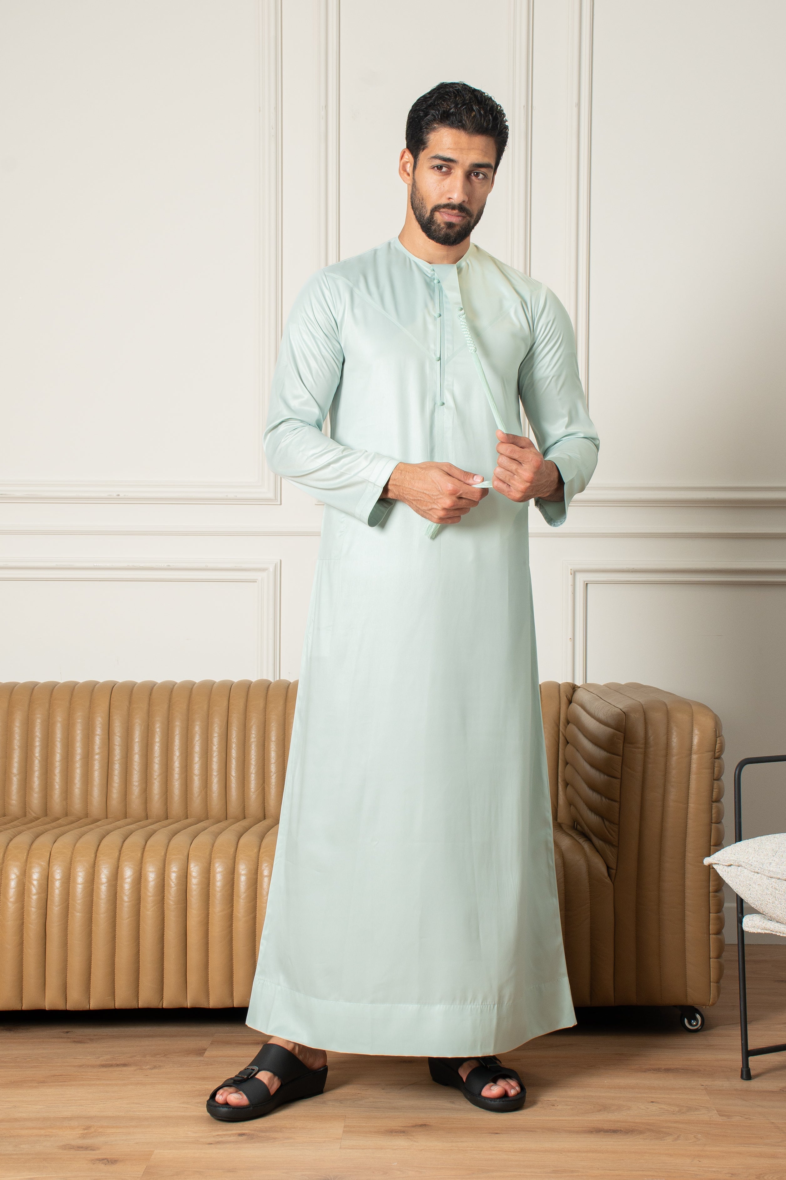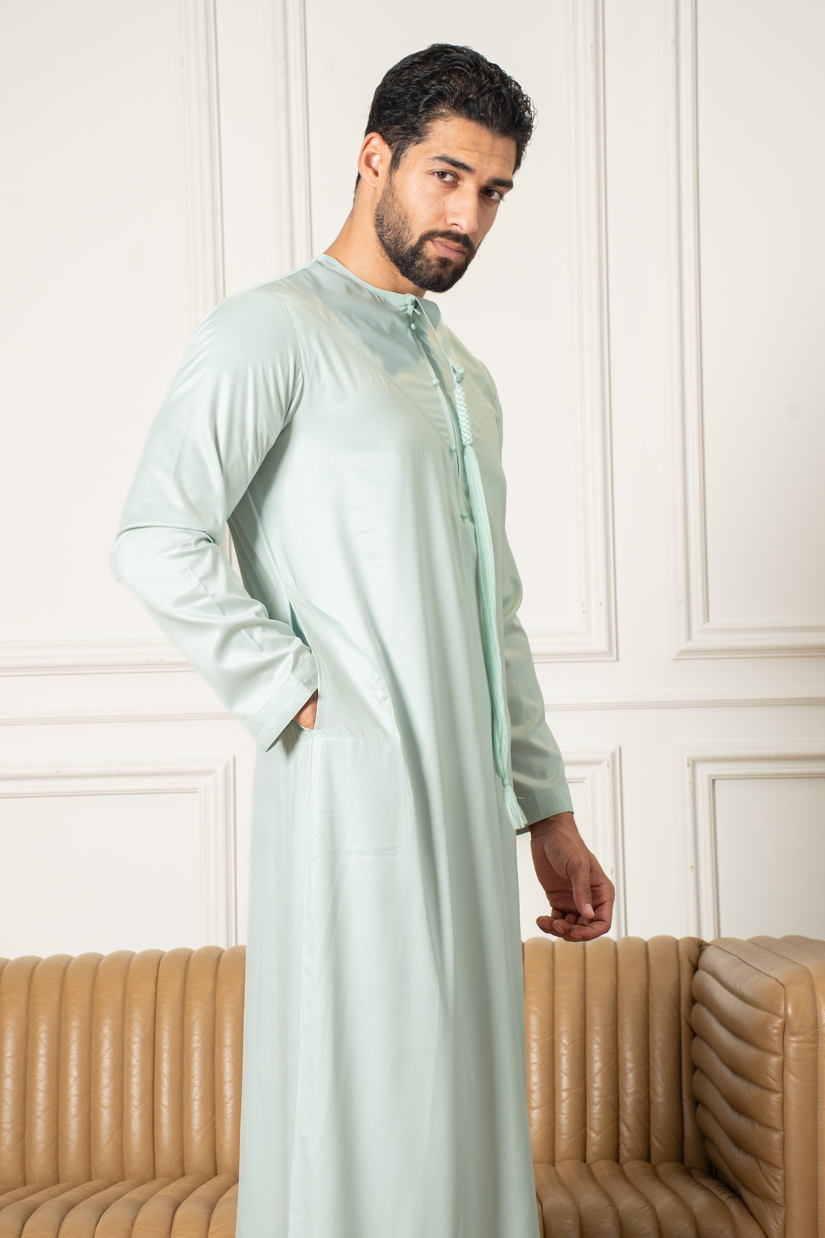 Exude timeless elegance with the Emirati Thobe in Glacier Green. Made from a luxurious shiny fabric, this thobe combines traditional Emirati design with a sophisticated sheen.
