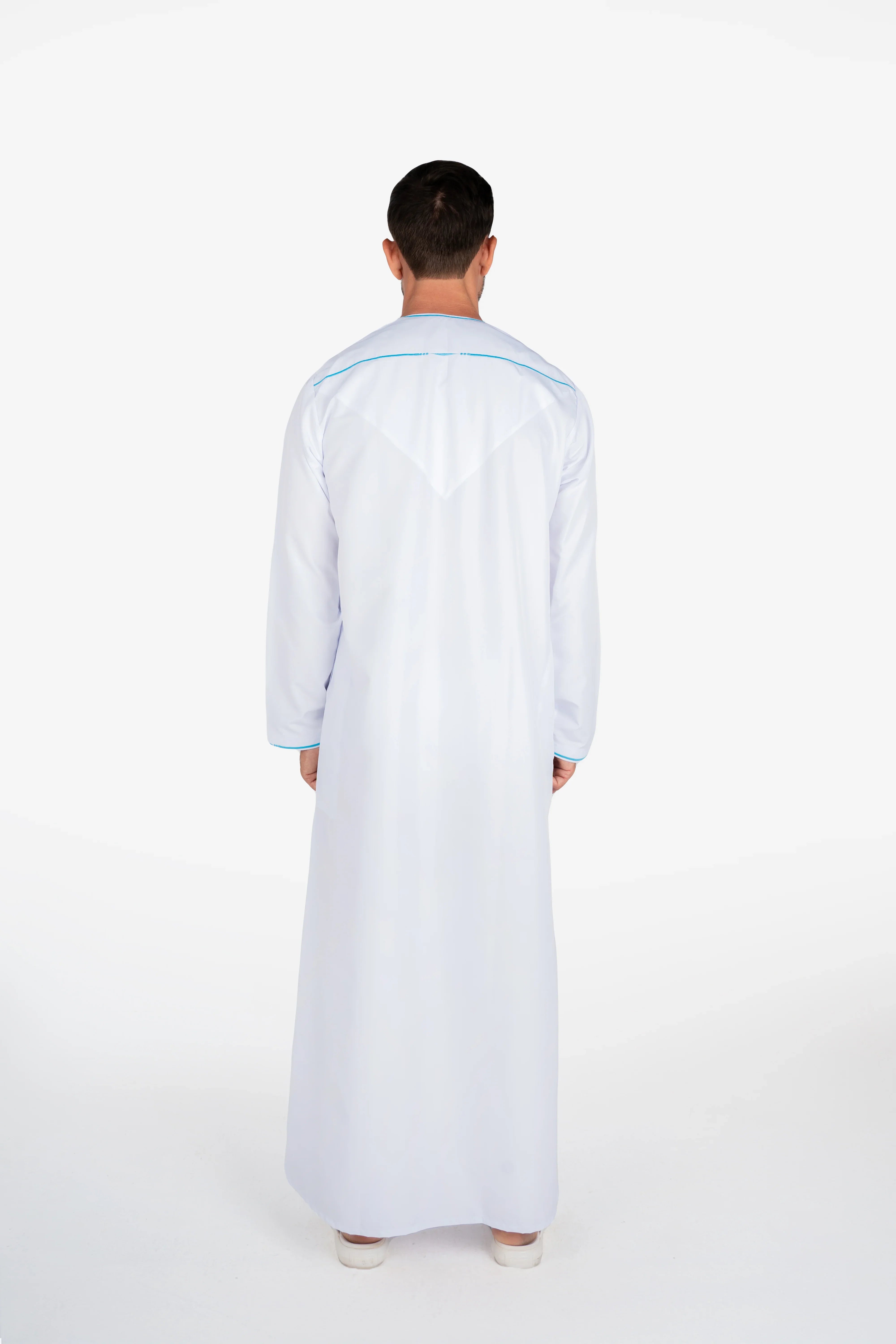 The thobe is available in a rich White & Ice Blue, embodying sophistication and cultural pride. Perfect for formal occasions, religious gatherings, or everyday wear, this thobe is a timeless expression of Omani elegance.