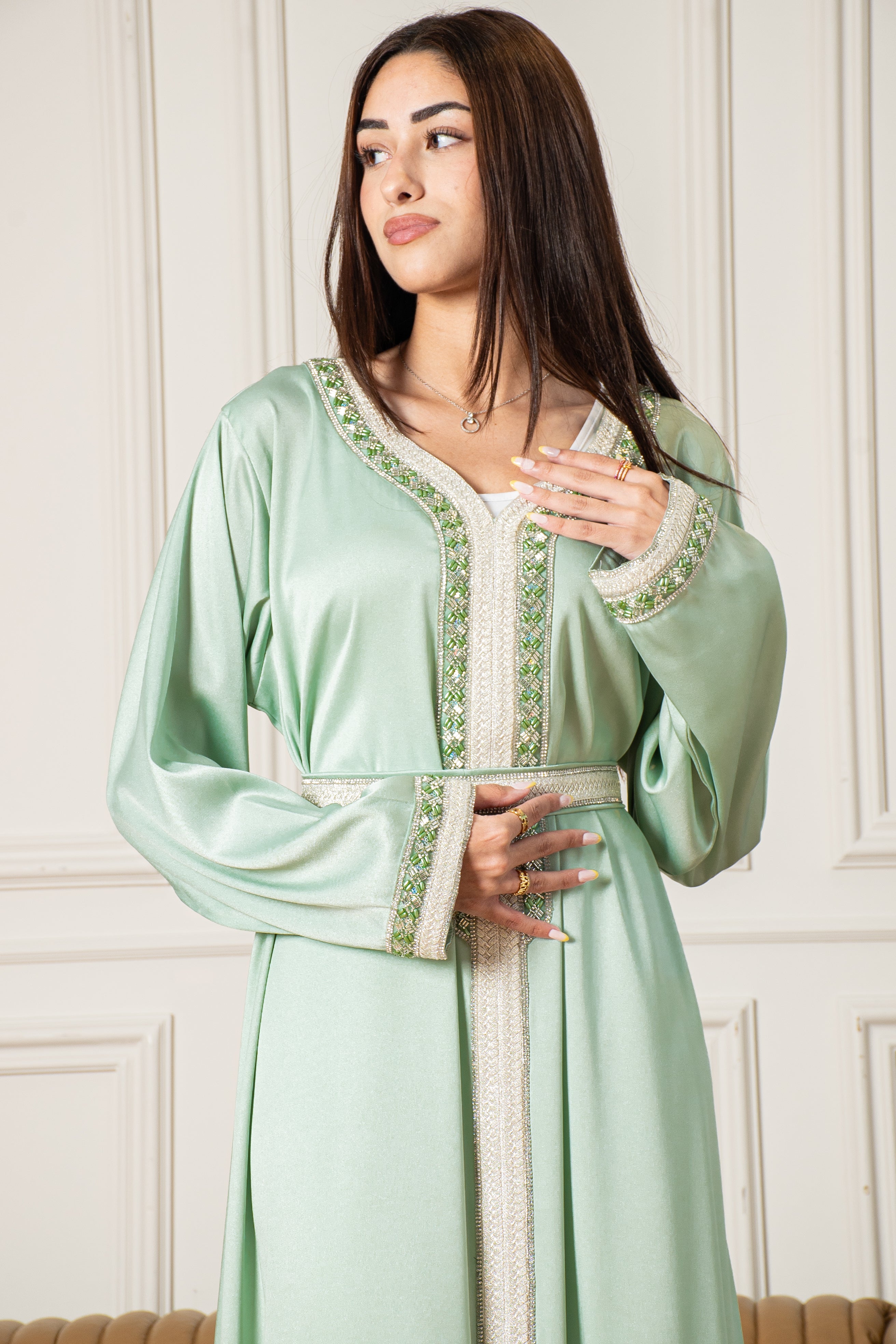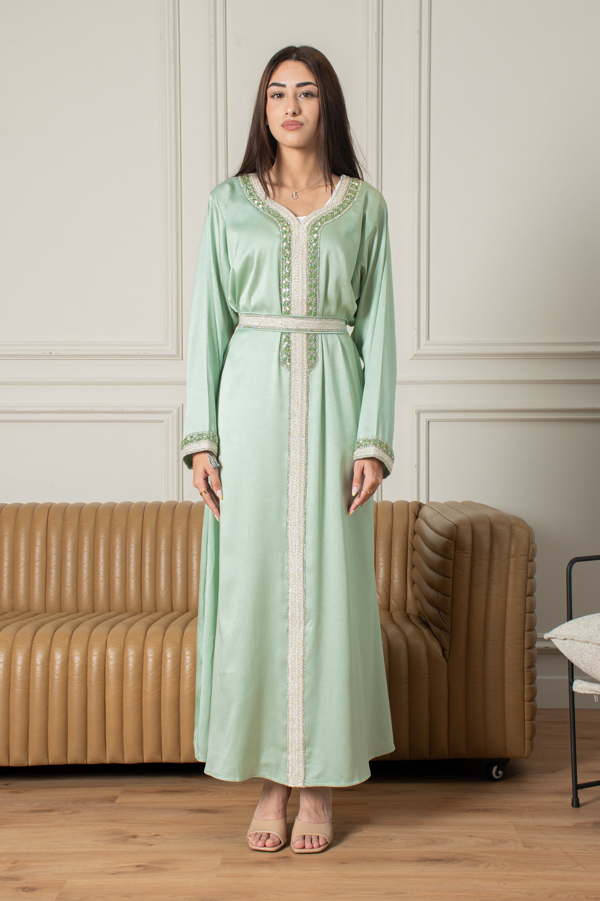 The Yasmine Djellaba is a two-piece Moroccan set that’s easy to wear and perfect for special occasions, featuring simple embroidery on the front and sleeves in a soft Mint Green colour. It comes with a belt that you can wear for a fitted look or leave off for a more relaxed style.